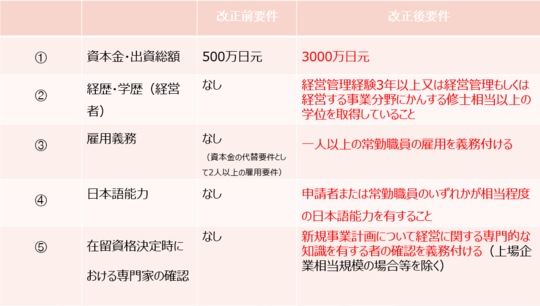 改正された省令の内容によると、「経営・管理」ビザの申請要件が大幅的に変更され、資本金の要件が引き上げられたほか、申請者の学歴や職業経歴に関する要件も新たに追加されました。