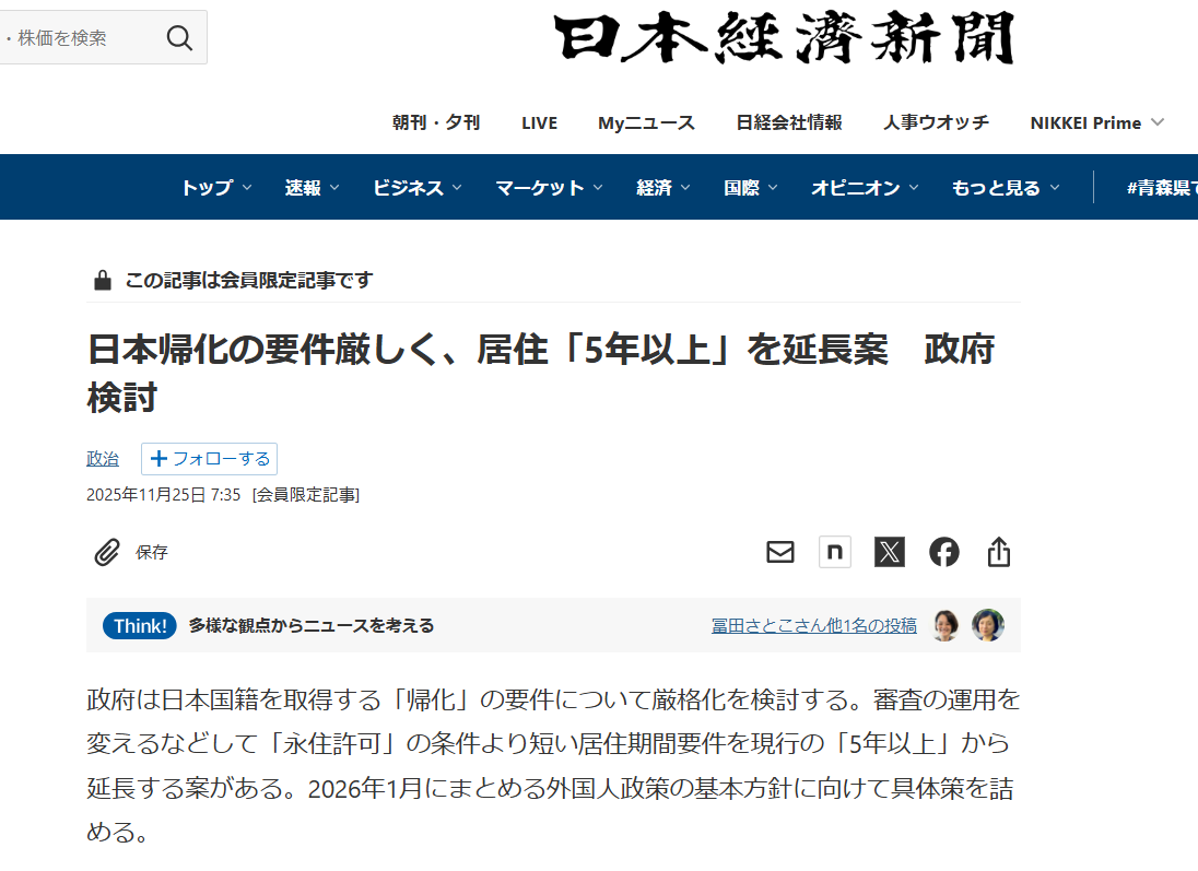 本次报道中提到的方案调整,并非立即修改法律条文,而是通过收紧审查运用的方式,在事实上提高居住年限和生活稳定程度的审查要求。具体而言,不再仅仅依据“居住满5年以上”这一形式性条件,而是将就业状况、收入情况、纳税状况、社会保险费的缴纳情况等因素进行综合确认,更加谨慎地判断是否具备长期稳定的生活基础。因此,即便形式上具备5年以上的居住记录,但若存在短期内频繁离职、收入波动较大、税费或社保缴纳延迟或未缴等情况,预计将更难获得归化许可。结果是,虽然“5年以上”这一数字可能保持不变,但在实际操作中,可能会将逐步转向要求更长且更稳定的在留与生活履历的方向发展。具体政策变动,预计将于2026年1月颁布。