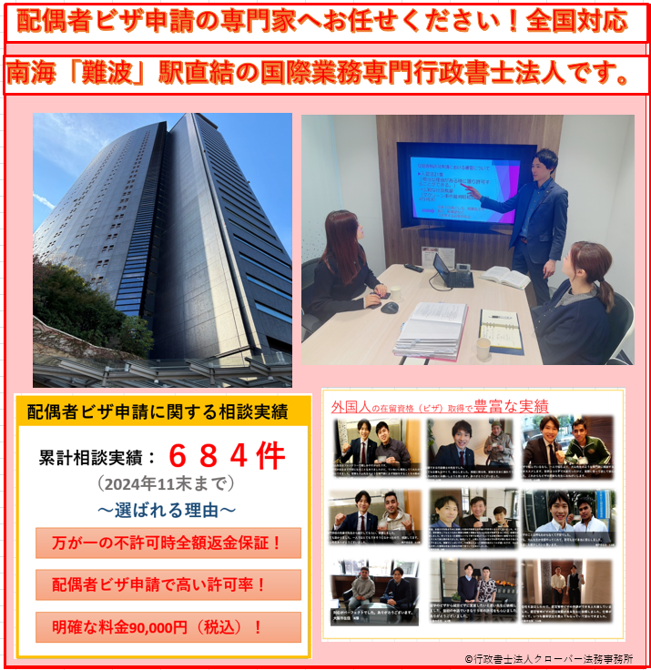 難波駅直結の大阪の行政書士法人クローバー法務事務所は短期滞在→配偶者ビザへの変更許可申請、年収が低い方々の配偶者ビザ申請、交際期間が短期間かつアプリでの出会い等の高難度案件の許可取得実績が豊富です。