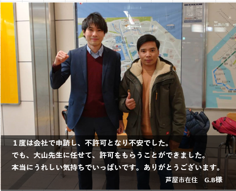 日本で働くことが夢でしたので、1度目の申請で許可をスムーズにとってくださって嬉しいです。